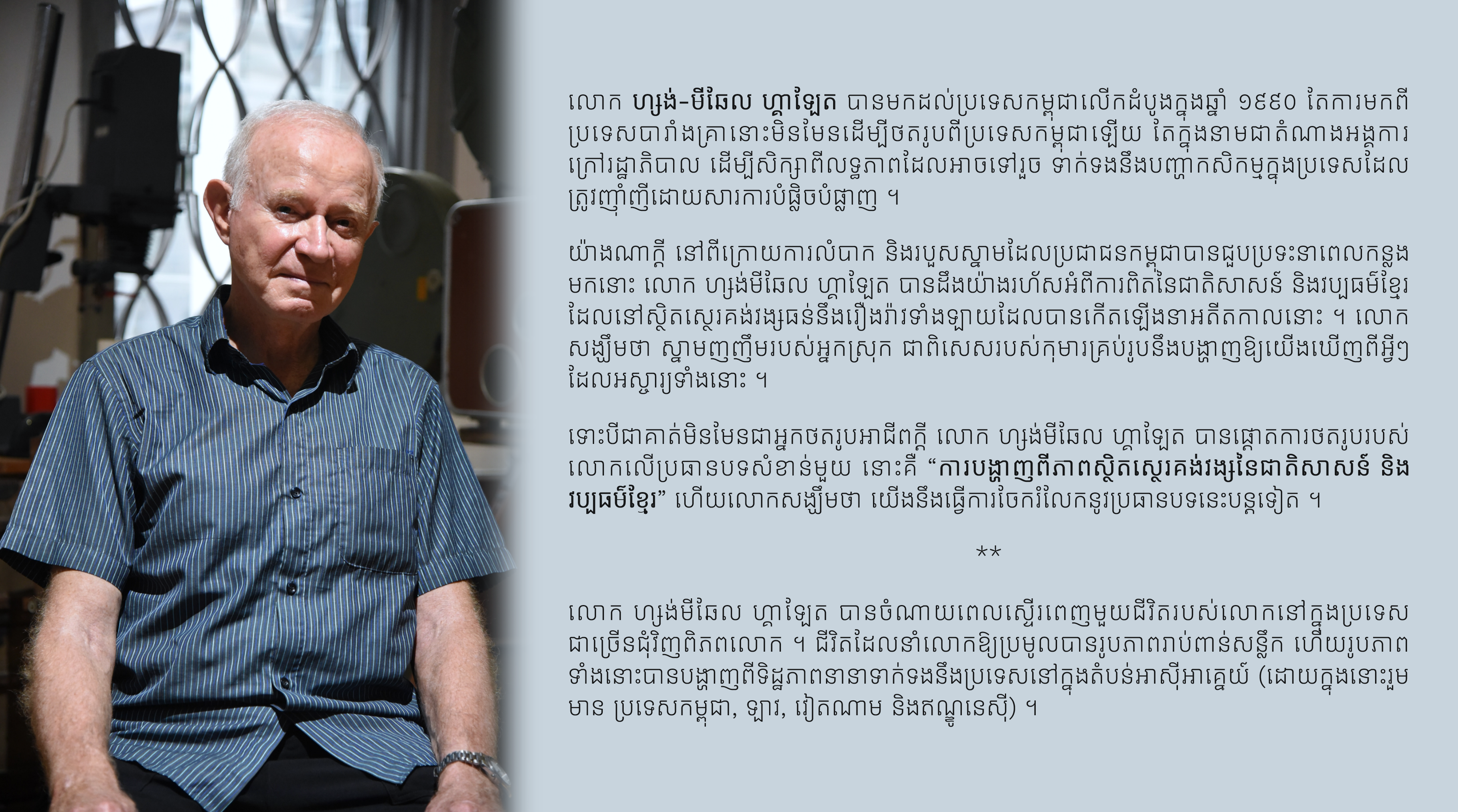 ប៉ុន្តែនៅពីក្រោយការលំបាក និងរបួសស្នាមដែលប្រជាជនកម្ពុជាបានជួបប្រទះនាពេលកន្លងមកនោះ លោក ហ្សង់មីឆែល ហ្គាឡែត បានដឹងយ៉ាងរហ័សអំពីការពិតនៃជាតិសាសន៍ និងវប្បធម៌ខ្មែរ ដែលវានៅស្ថិតស្ថេរគង់វង្សធន់នឹងរឿងរ៉ាវកាលពីអតីតកាលដែលបានកើតឡើងទាំងនោះ ។ សង្ឃឹមថា ស្នាមញញឹមរបស់អ្នកស្រុក ជាពិសេសរបស់កុមារគ្រប់រូបនឹងបង្ហាញឱ្យយើងឃើញពីអ្វីៗដែលអស្ចារ្យទាំងនោះ ។